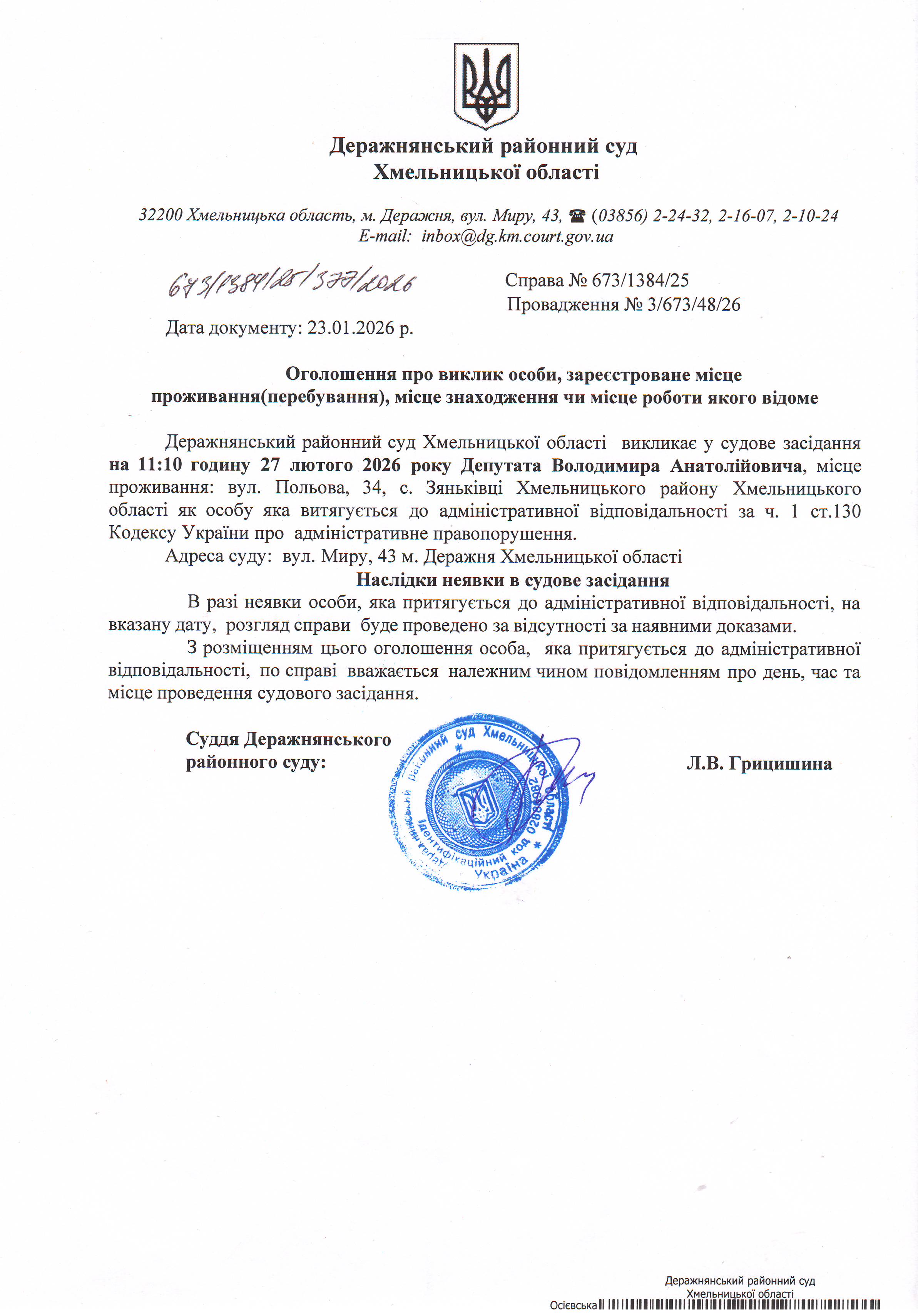 Оголошення про виклик до суду Депутата Володимира Анатолійовича