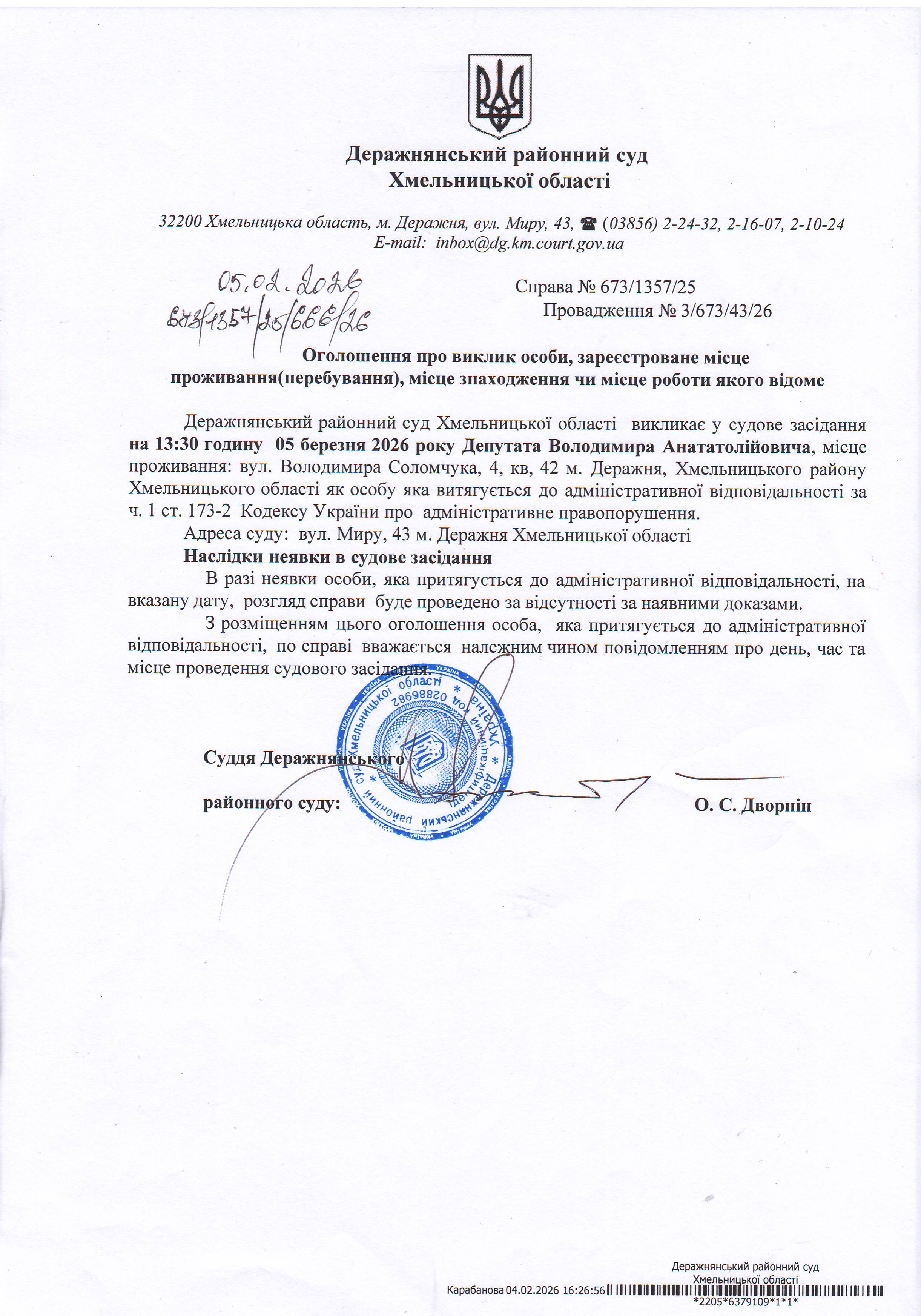 Оголошення про виклик до суду Депутата Володимира Анатолійовича