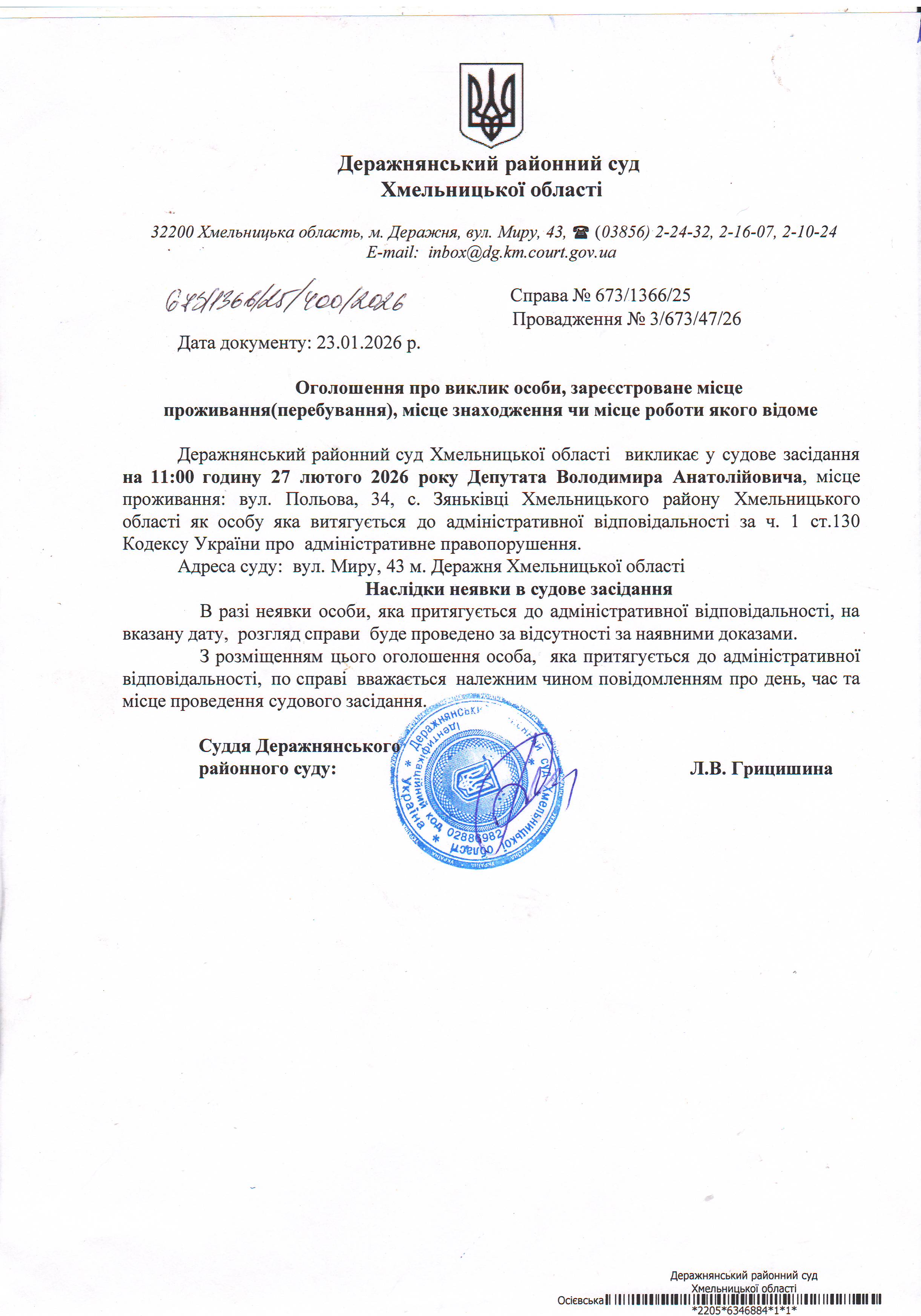 Оголошення про виклик до суду Депутата Володимира Анатолійовича