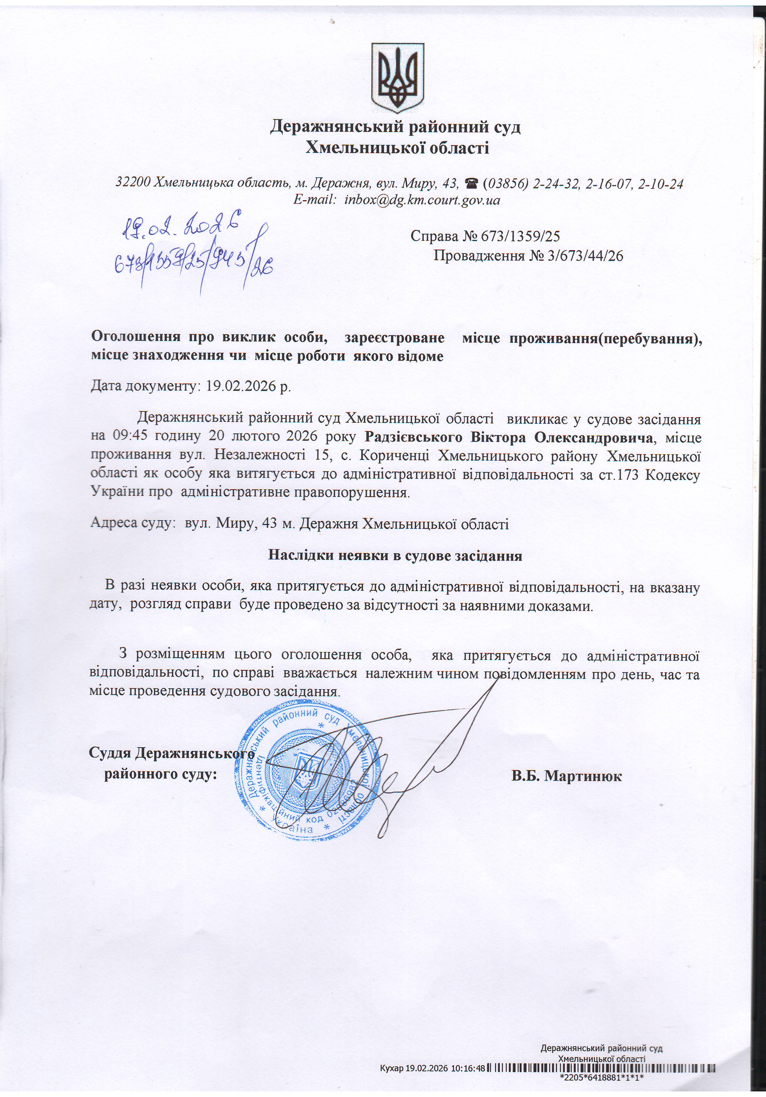 Оголошення про виклик до суду Радзієвського Віктора Олександровича